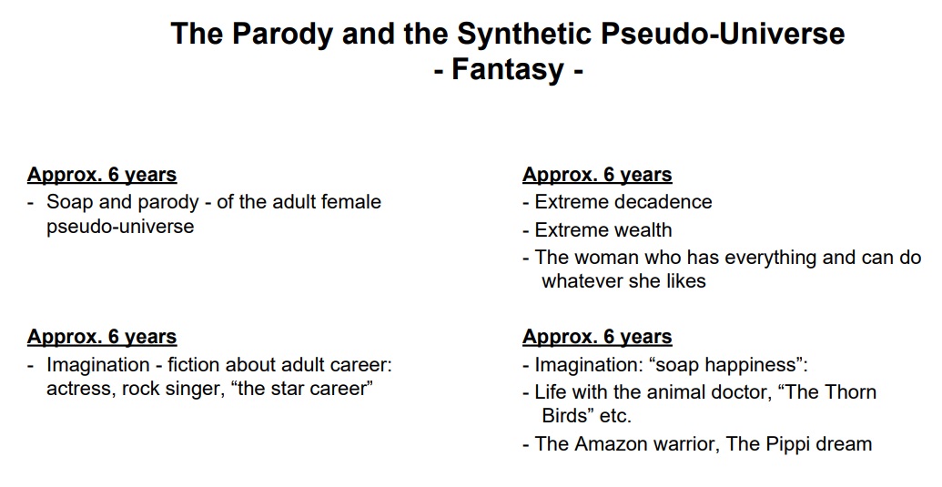 The decadent feminine world is new and exciting for six year old girls because it demonstrates some of the disadvantages of feminine desires and dreams about security, safety, adoration and love. Decadence demonstrates what constitutes real abuse of distinct concepts, e.g. extreme wealth, ruthless abuse of power and dominating love.